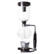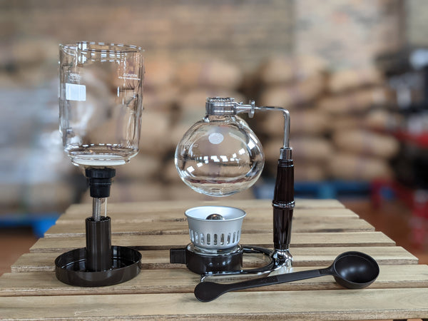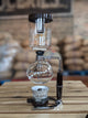 This syphon is supported by a metal and resin stand that holds the brewer over an open flame or halogen burner. The water in the lower bowl heats up and pressure builds causing the water to rise up to the top chamber. Coffee is brewed in the top bowl and when desired extraction is achieved, the heat source is removed and the coffee filters back into the bottom bowl, leaving a clean balanced cup.