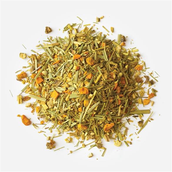 The awesome, centering energy of golden turmeric root is enhanced by strengthening licorice root and zesty ginger in this Ayurveda inspired blend. Fragrant lemongrass and citrus peels create a lemon drop candy sweetness that balances the pungency of the roots. The combination of turmeric, ginger, lemon and honey is an ancient herbal recipe for longevity, stamina and balance.